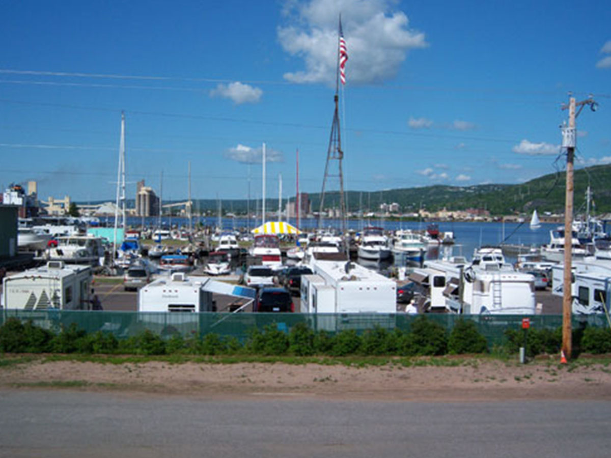 Lakehead Boat Basin offers 30 RV parking sites. Twelve of the sites have water, electric and sewer. These sites are located immediately to the right as you enter into the gated area and overlook the main front dockage area of the marina. The other eighteen sites have electric and water. These sites are located to the left and behind the building and overlook the Duluth hills, marina and the famous Ariel Lift Bridge. All locations are on blacktop (area used for boat storage in the winter).